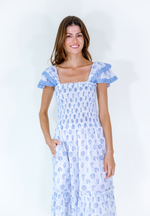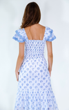 Breezy, floral, and effortlessly feminine — the Daphne Dress is your go-to for sunny days and garden parties. Featuring a smocked bodice, flattering square neckline, and cap sleeves with embroidered trim, this midi-length beauty is crafted in a soft, breathable cotton blend with a delicate green and blue floral print. Bonus: it has pockets.
