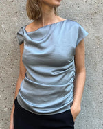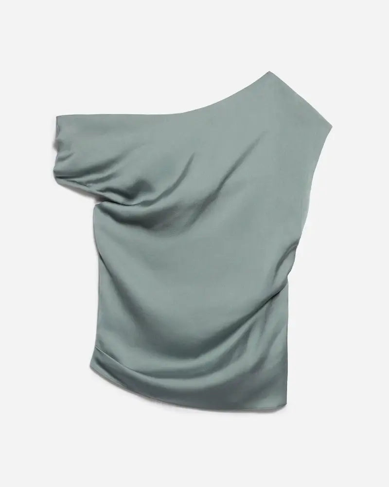 The asymmetrical Ezai top embodies modern elegance with its draped cut and bare shoulder. Crafted from a silky fabric with a flawless drape, it enhances the silhouette with subtle pleats that add movement. Its refined, contemporary look makes it a statement piece, ideal for a dressy outfit or a sophisticated daytime look. It can be worn tucked into flowing pants or over a fitted skirt for a chic effect.