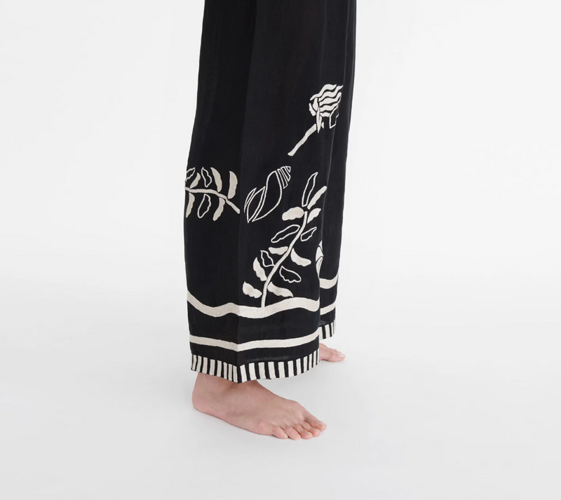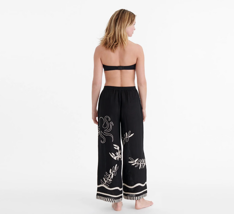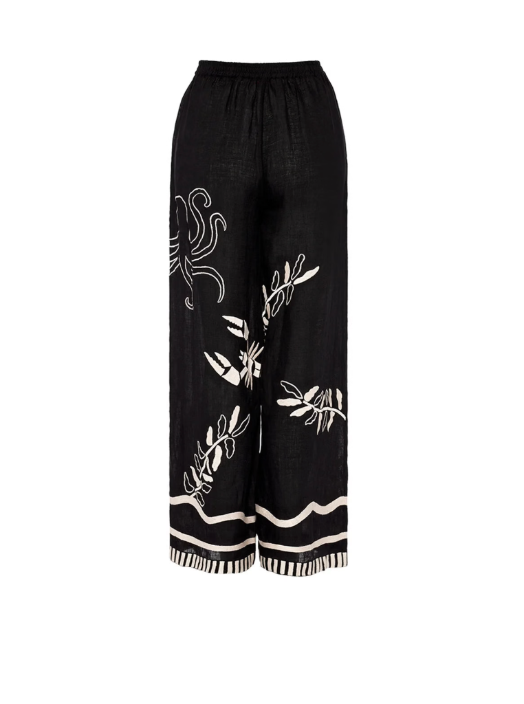 The front and back of our Octopus trousers are embellished with embroidery, inspired by the underwater world. Their silhouette is both comfortable and elegant, perfect for enjoying your summer days and nights in effortless style.